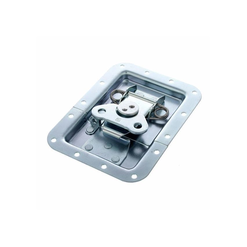 Butterfly large, with eyelet for a padlock. The closing mechanism of the butterfly is equipped with a counter pressure spring to be automatically guided out at its opening position of approx. 30º. If required, the closing hook can also be moved further out.