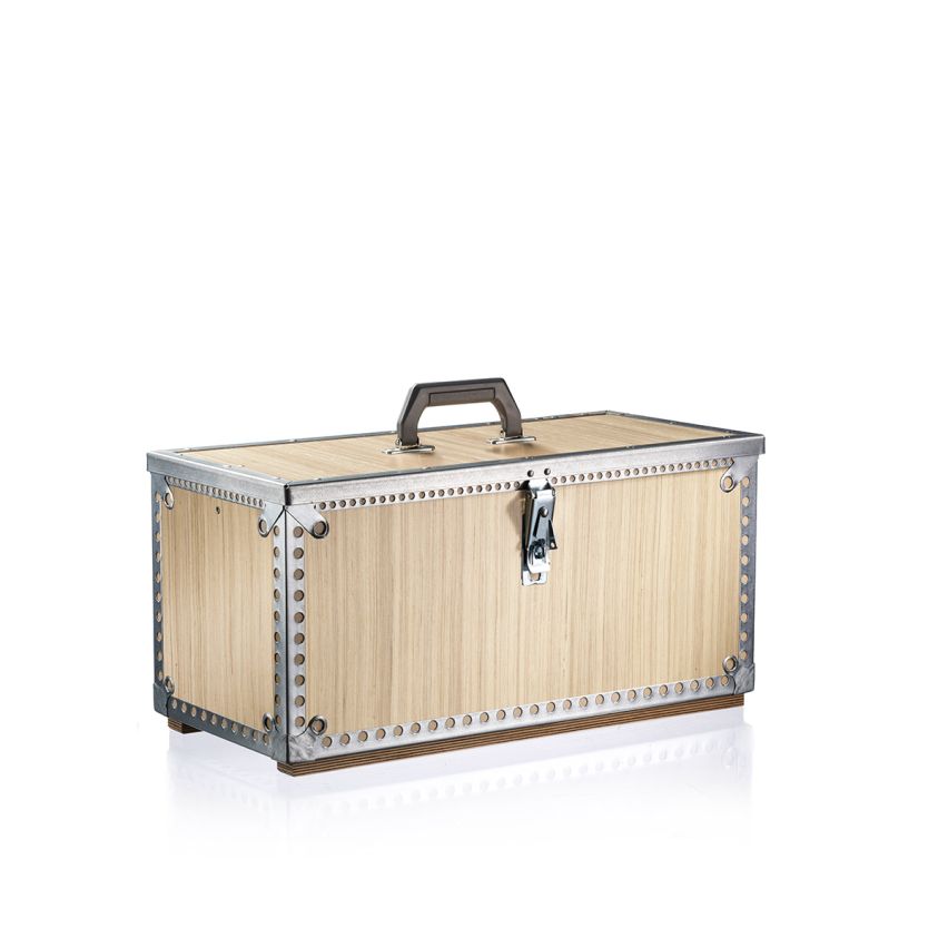 Woody Box™ er en kasse produceret af høj kvalitet, vandfast birkekrydsfiner som er forstærket med stærke metalbånd, bæregreb og hængelåsoverfald - af stål!