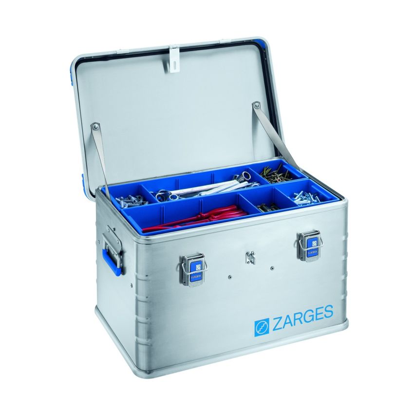 ZARGES EUROBOX er den stabile og lette Alu Kasse / transportkasse med de markant blå hjørner. ZARGES EUROBOX er støv- og stænktæt udstyret med to stabile lågstropper og kvalitetslukkere.